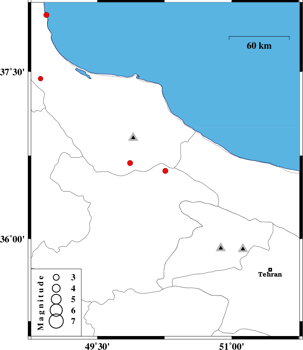 | 2017/07/15 | 07:36:04.2 | 12:06:04.2 | 37.438 | 48.866 | 14 | ML2.4 | Gilan Province, 27 km -West of Masal |