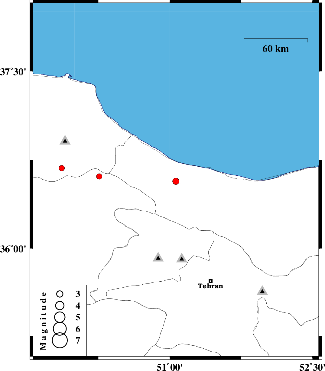 | 2017/08/12 | 06:25:56.2 | 10:55:56.2 | 36.613 | 50.259 | 15 | ML2.7 | Ghazvin Province, 58 km South of Rudsar | ||