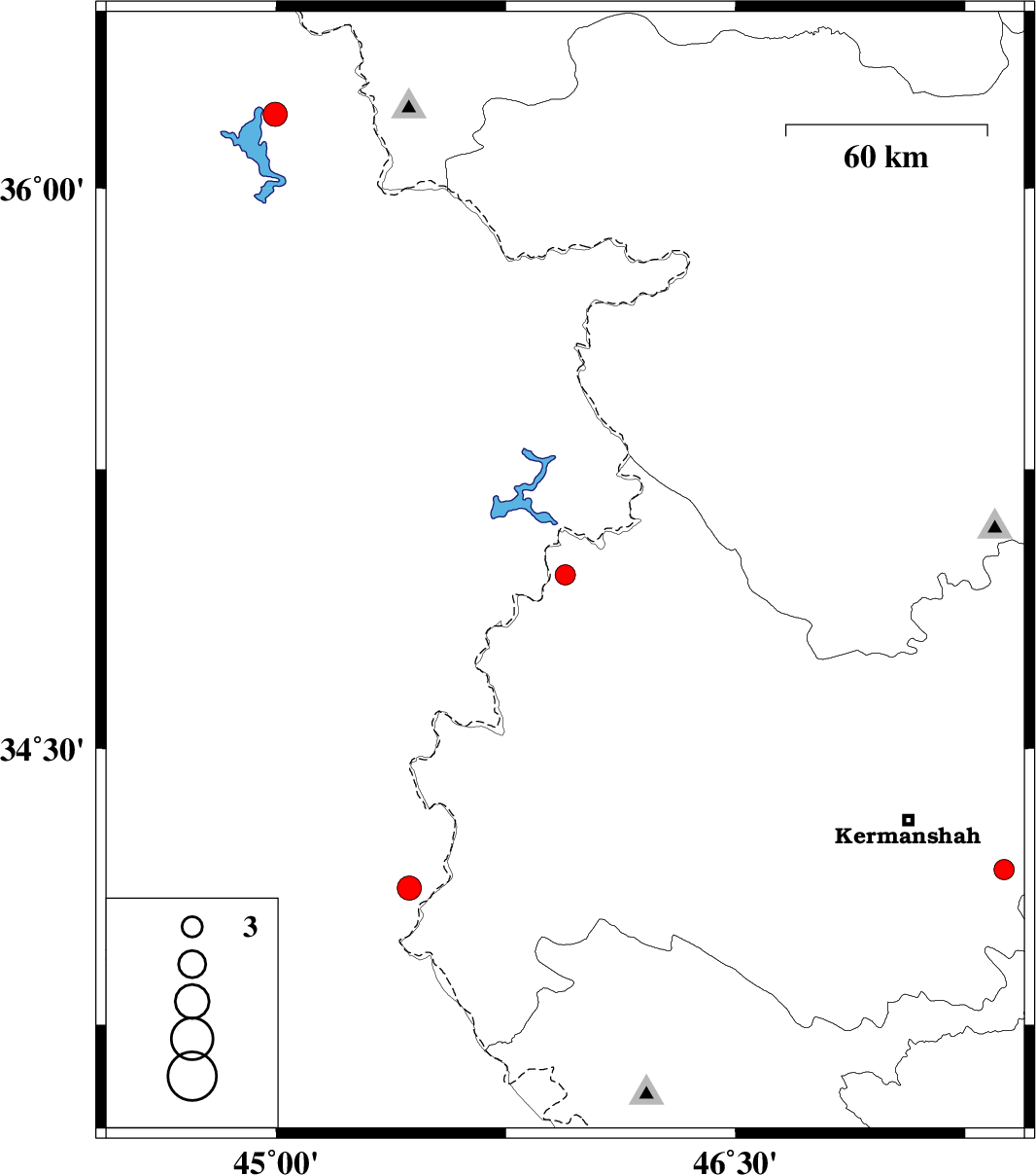 | 2017/07/27 | 20:10:32.2 | 00:40:32.2 | 34.172 | 47.378 | 14 | ML2.9 | Kermanshah Province, 21 km -West of Harsin | ||