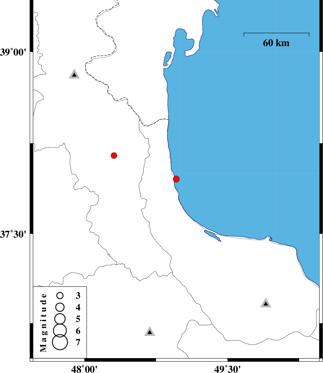 | 2017/08/23 | 07:07:34.7 | 11:37:34.7 | 37.954 | 48.962 | 16 | ML3 | Caspian Sea, 18 km North of Hashtpar | ||