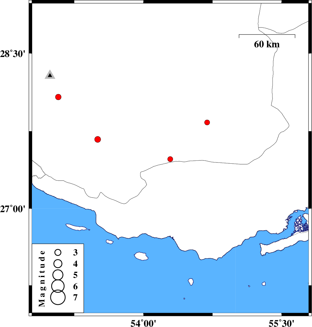 | 2017/09/02 | 18:04:25.8 | 22:34:25.8 | 27.671 | 53.503 | 11 | ML3 | Fars Province, 50 km North-East of Lamerd |
