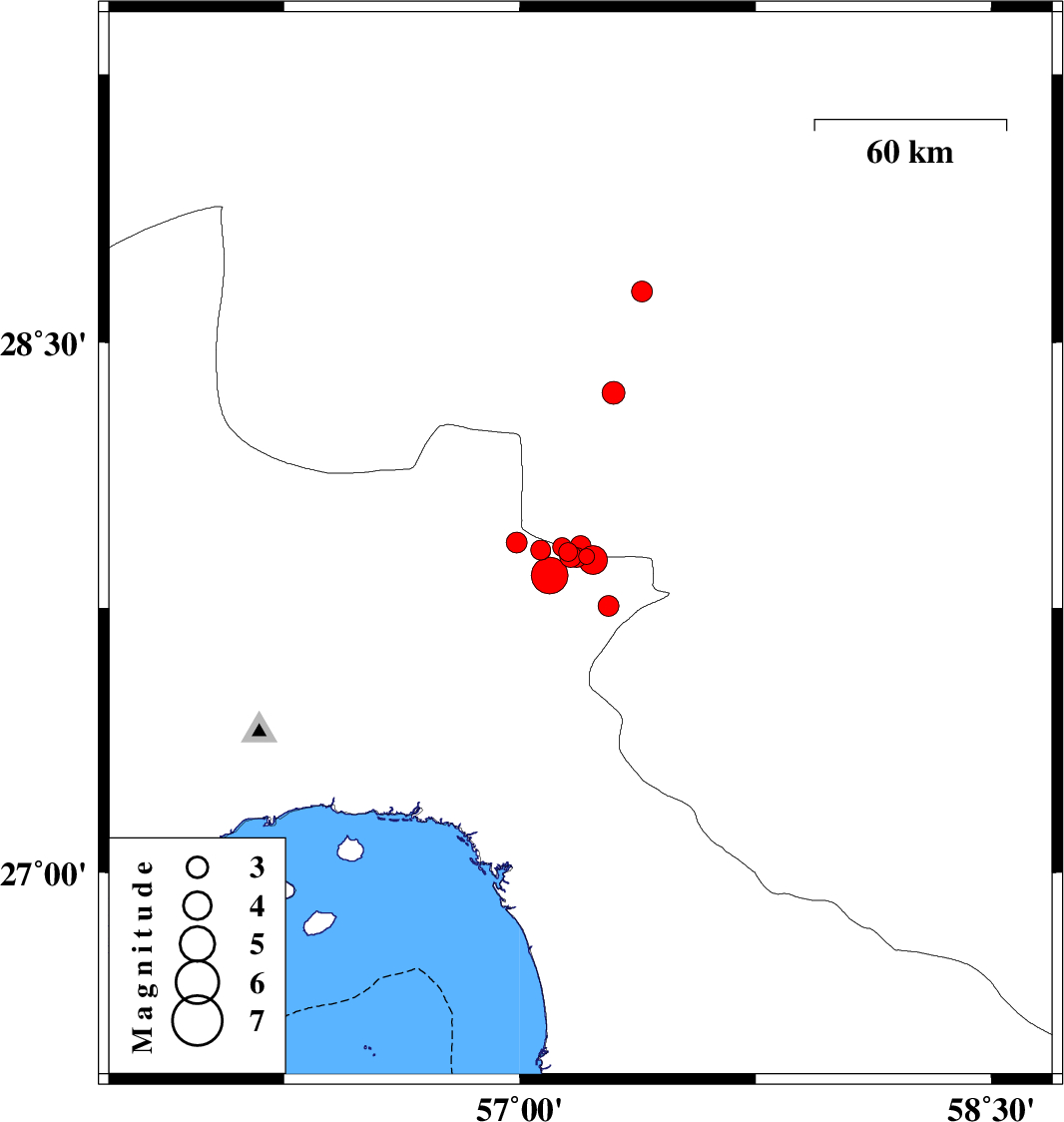 2017/08/31 03:22:18.4 07:52:18.4 27.93556.9914 ML2.9 Hormozgan Province, 69 km -West of Kahnuj