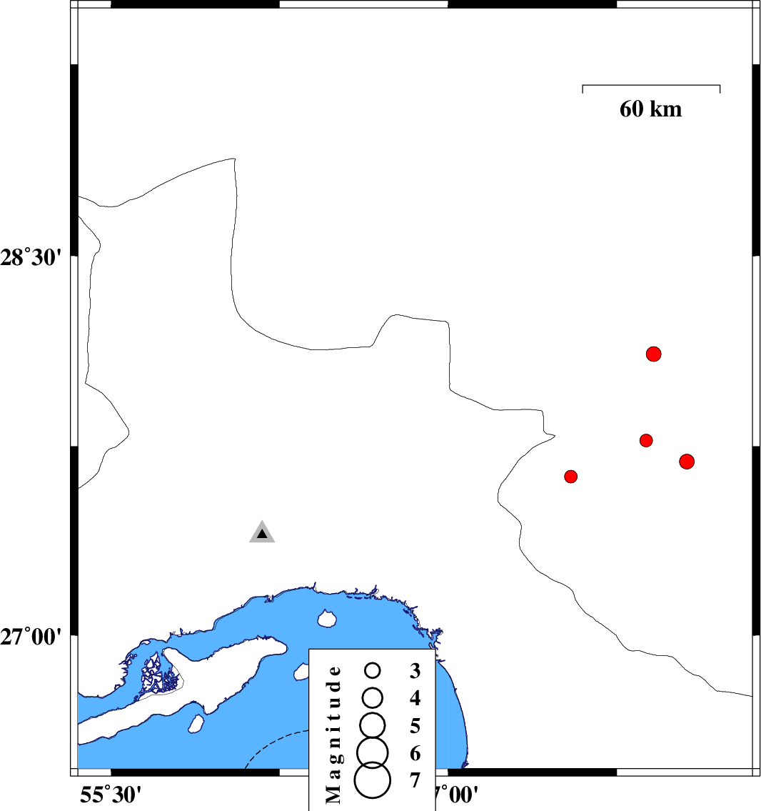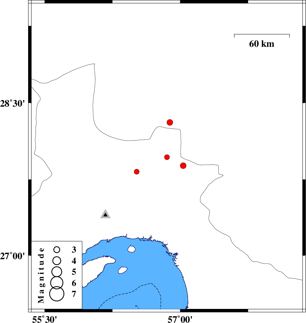 | 2017/09/17 | 22:44:17.4 | 03:14:17.4 | 27.886 | 57.033 | 14 | ML2.9 | Hormozgan Province, 55 km North-West of Dehbarez | ||