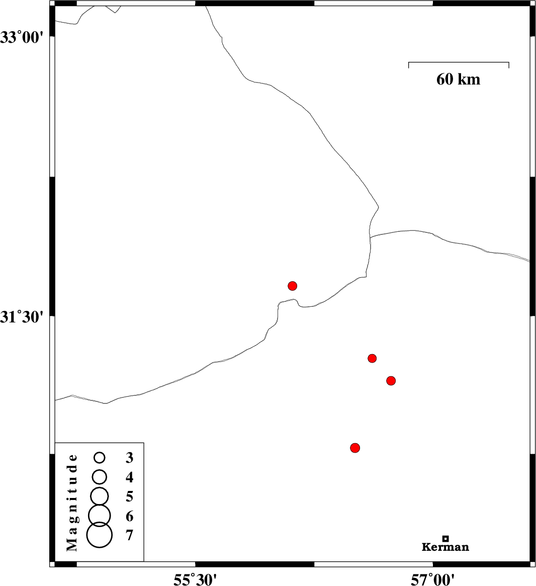 | 2017/03/09 | 13:16:30.8 | 16:46:30.8 | 31.149 | 56.734 | 14 | ML2.6 | Kerman Province, 15 km South of Ravar |