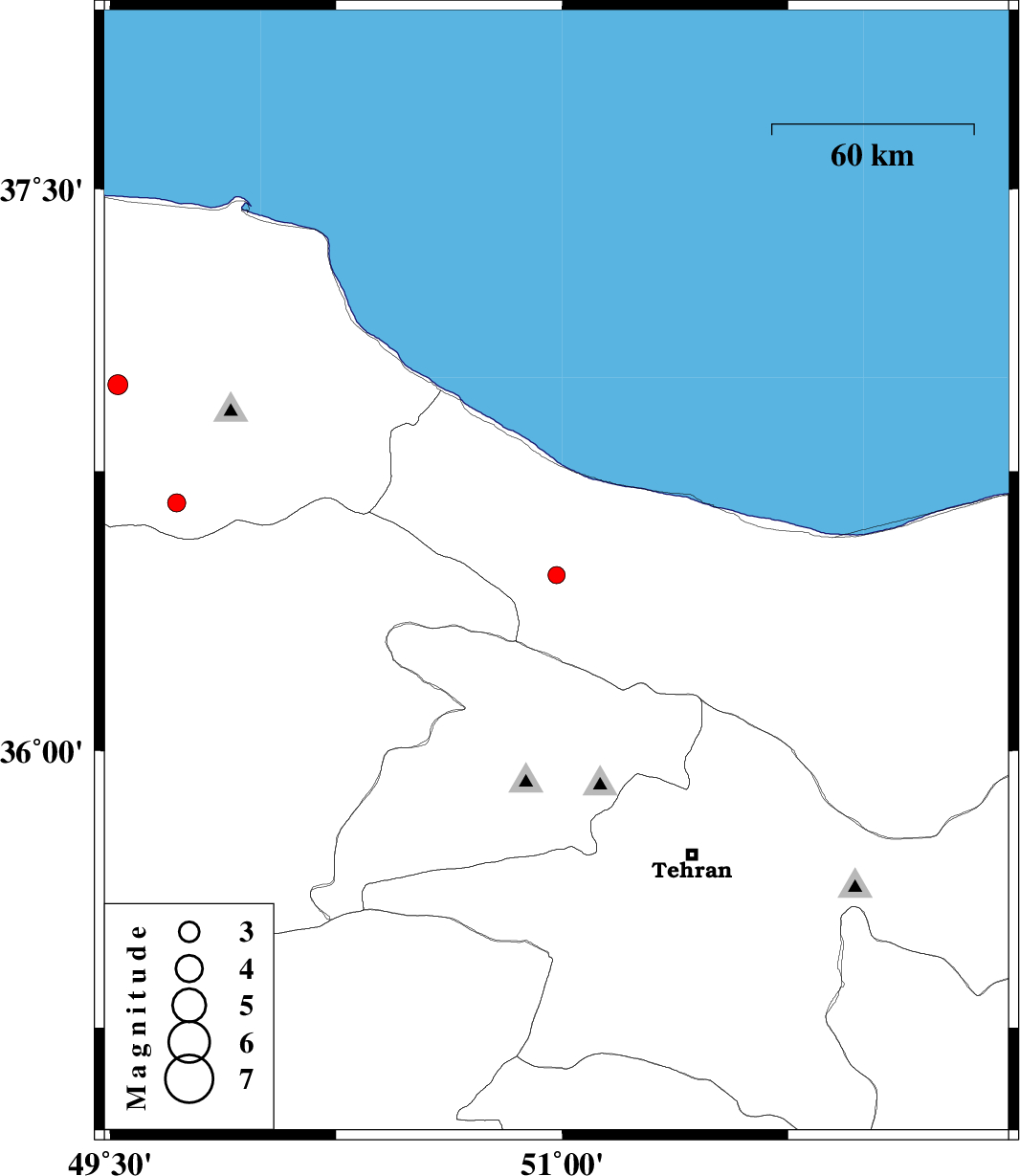 | 2017/10/01 | 19:55:05.2 | 23:25:05.2 | 36.981 | 49.525 | 6 | ML2.9 | Gilan Province, 20 km North of Rudbar | ||