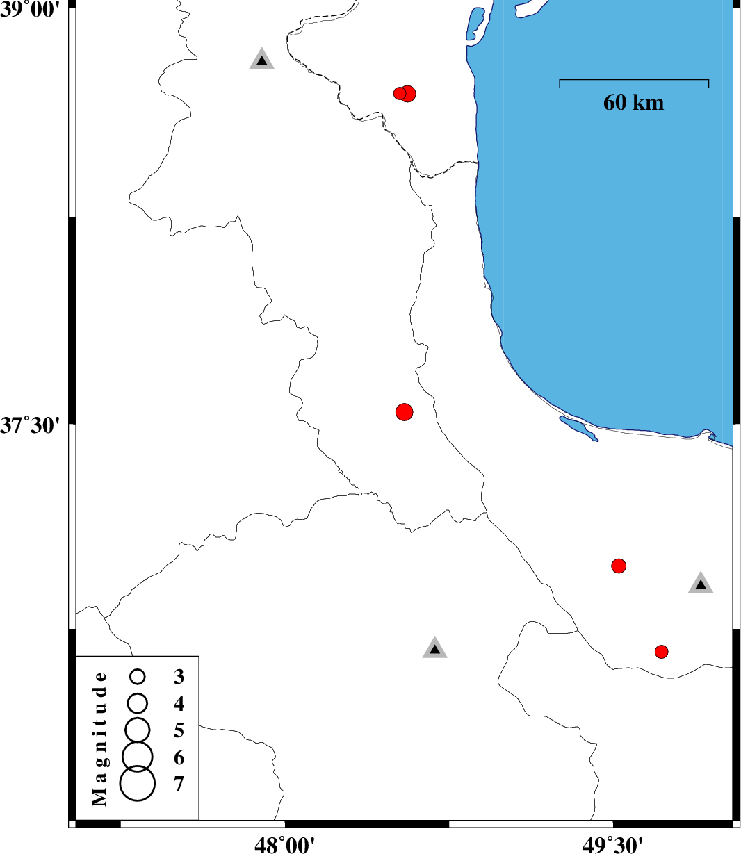 | 2017/10/01 | 19:55:05.2 | 23:25:05.2 | 36.981 | 49.525 | 6 | ML2.9 | Gilan Province, 20 km North of Rudbar | ||