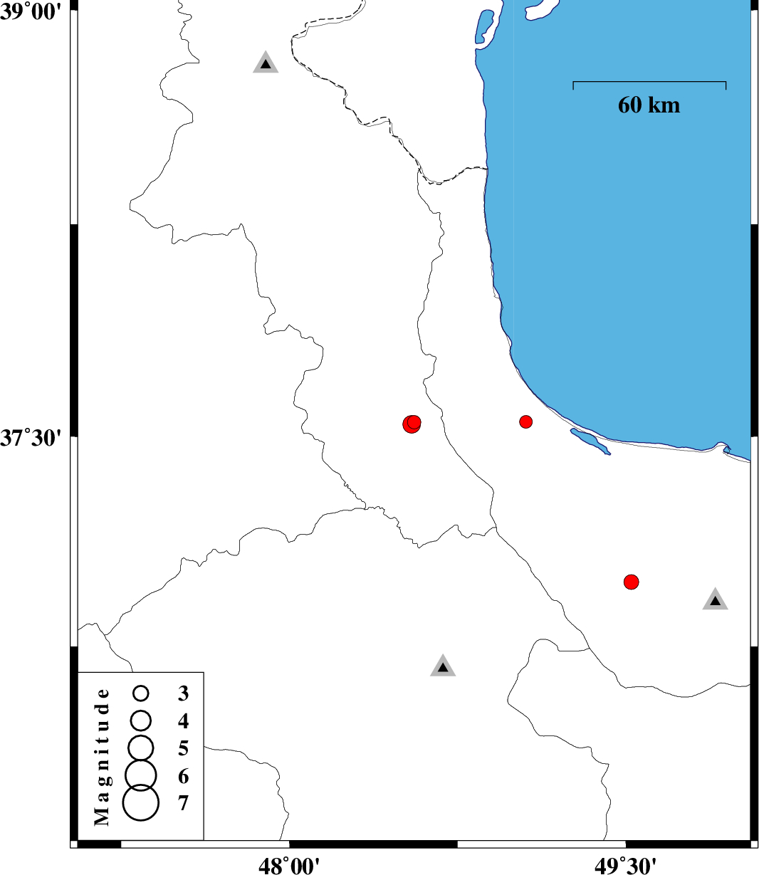| 2017/10/01 | 19:55:05.2 | 23:25:05.2 | 36.981 | 49.525 | 6 | ML2.9 | Gilan Province, 20 km North of Rudbar |