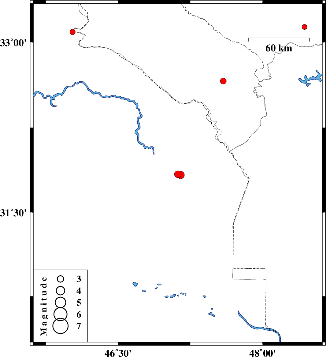 | 2017/10/20 | 02:19:40.9 | 05:49:40.9 | 31.838 | 47.121 | 15 | ML3.2 | Iraq, 96 km South-West of Dehloran | ||