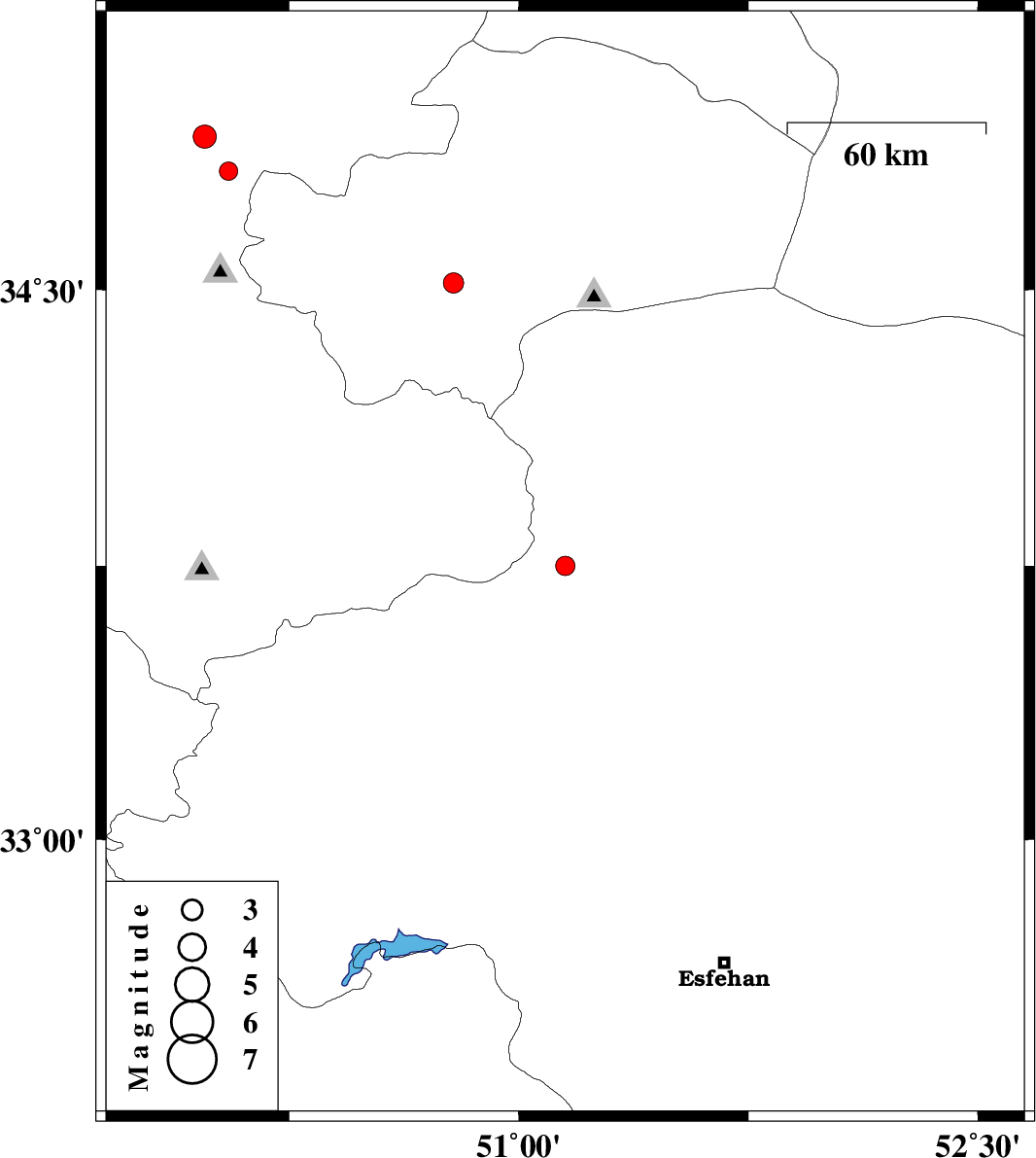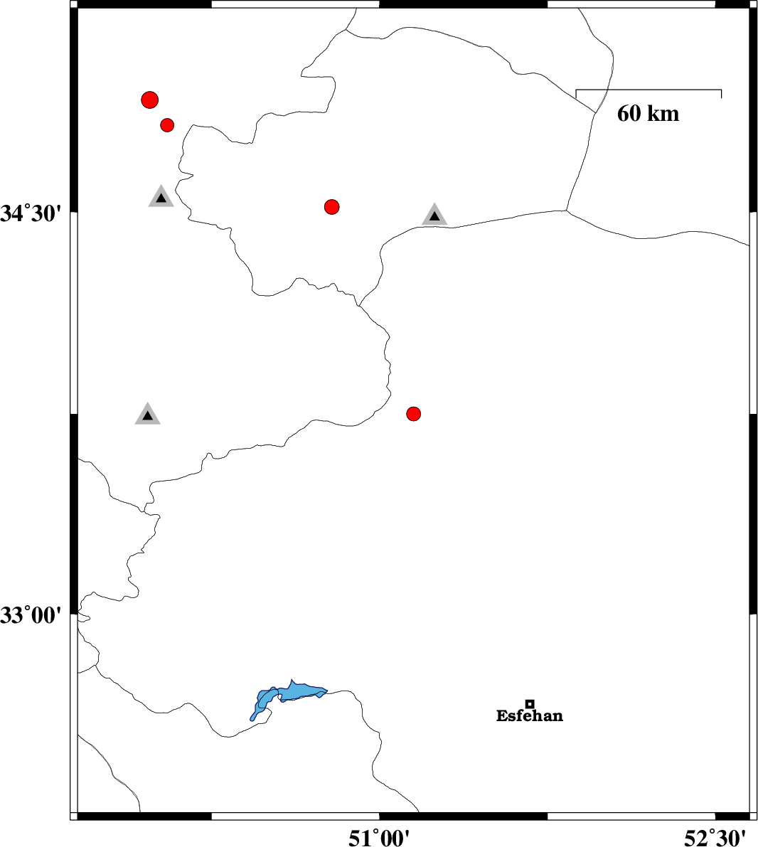 | 2017/10/21 | 01:39:45.8 | 05:09:45.8 | 33.751 | 51.152 | 17 | ML2.8 | Esfahan Province, 38 km South-West of Kashan | ||