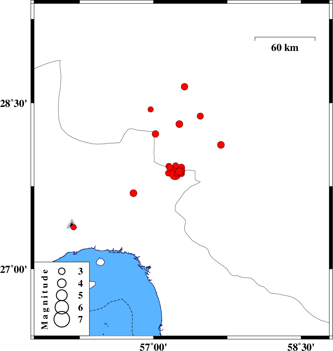 2017/10/23 02:05:37.9 05:35:37.9 27.9357.15714 ML2.8 Kerman Province, 53 km -West of Kahnuj