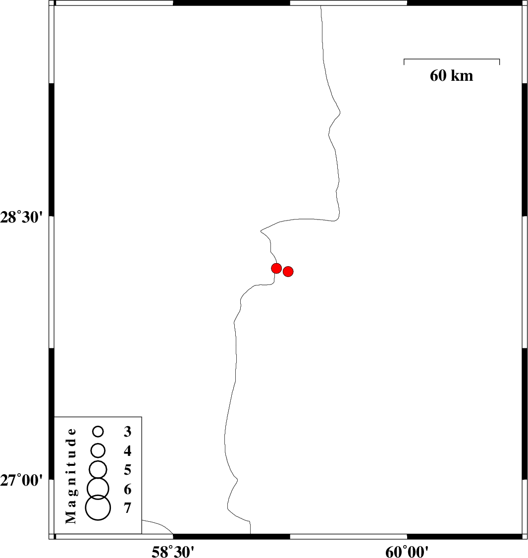 | 2017/10/26 | 01:33:45.7 | 05:03:45.7 | 28.204 | 59.162 | 14 | ML3 | Sistan va Baloochestan Province, 128 km South-East of Bam |