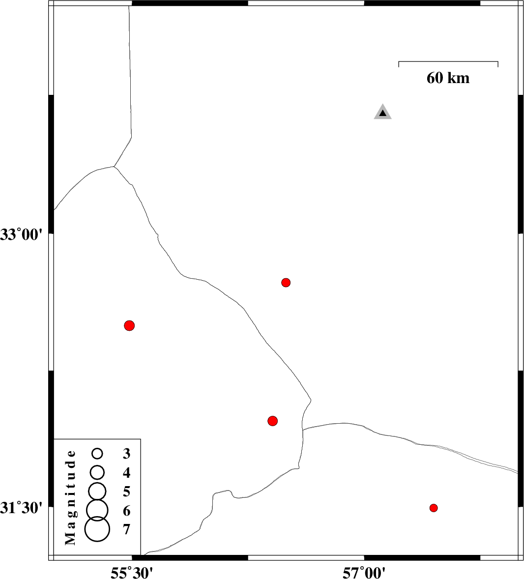 | 2017/10/28 | 19:11:10.4 | 22:41:10.4 | 32.731 | 56.494 | 14 | ML2.6 | Yazd Province, 105 km South-West of Tabas | ||