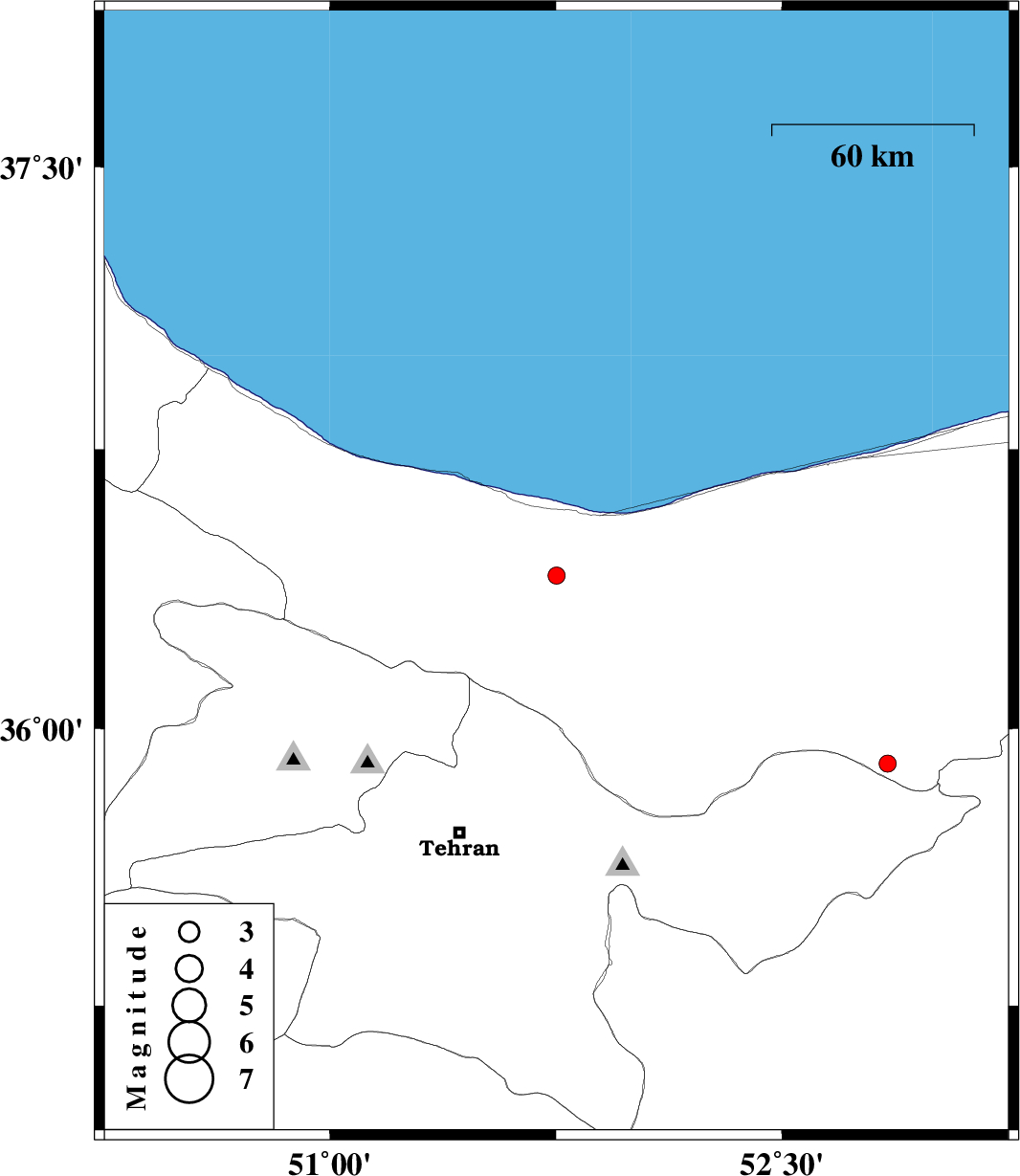 | 2017/10/31 | 03:46:37.2 | 07:16:37.2 | 36.412 | 51.752 | 6 | ML2.5 | Mazandaran Province, 31 km South-West of Nur | ||