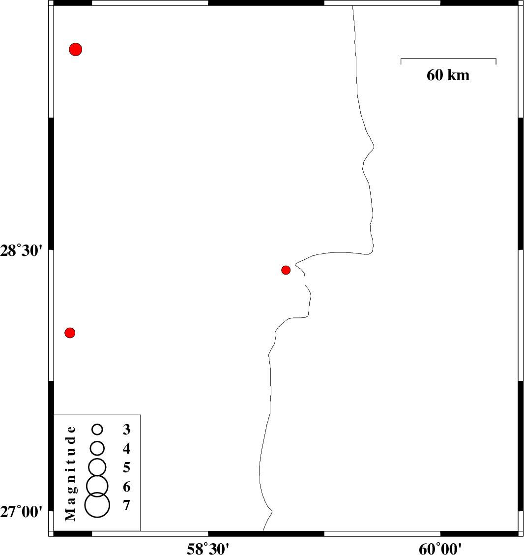 | 2017/03/13 | 06:51:56.4 | 10:21:56.4 | 28.024 | 57.606 | 14 | ML2.9 | Kerman Province, 12 km of Kahnuj |