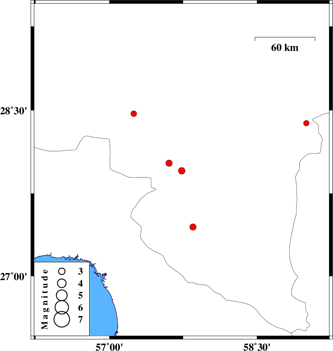 | 2017/03/13 | 06:51:56.4 | 10:21:56.4 | 28.024 | 57.606 | 14 | ML2.9 | Kerman Province, 12 km of Kahnuj |