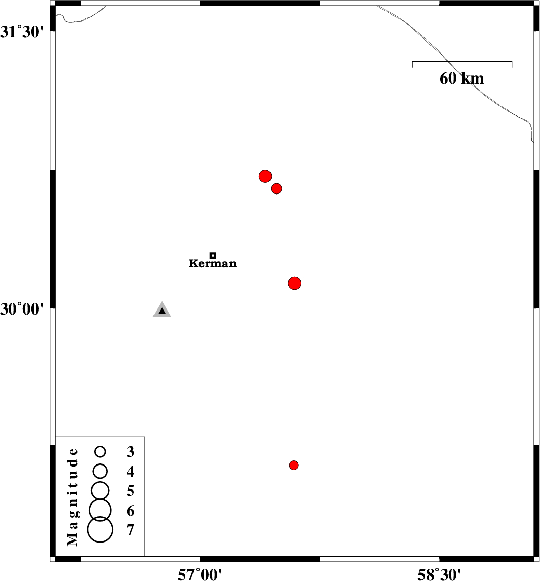 | 2017/11/18 | 01:19:39.1 | 04:49:39.1 | 30.65 | 57.478 | 6 | ML3 | Kerman Province, 56 km North-East of Kerman | ||