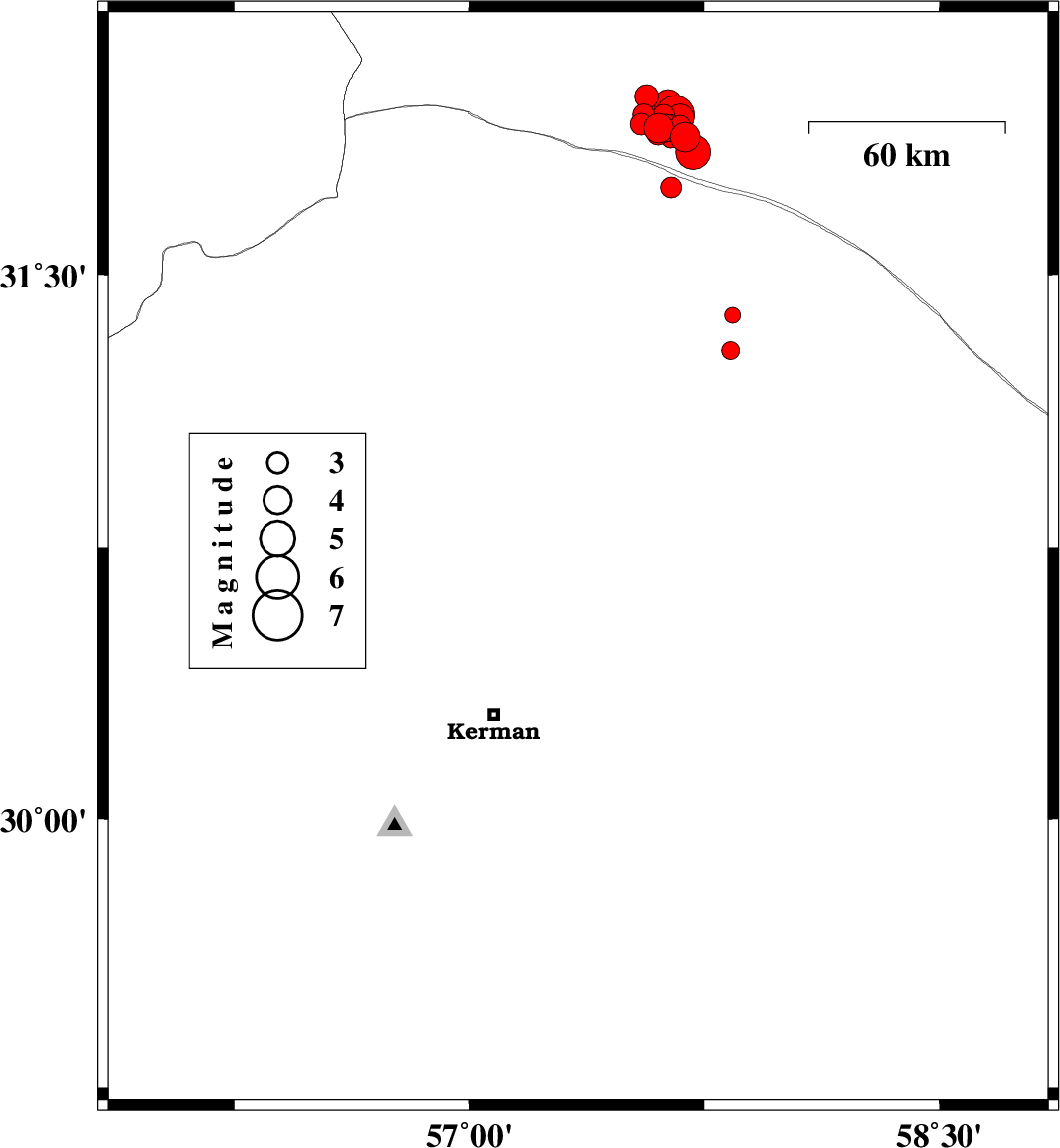 2017/12/01 03:35:00.5 07:05:00.5 30.75257.39916 ML5.5 Kerman Province, 60 km North-East of Kerman