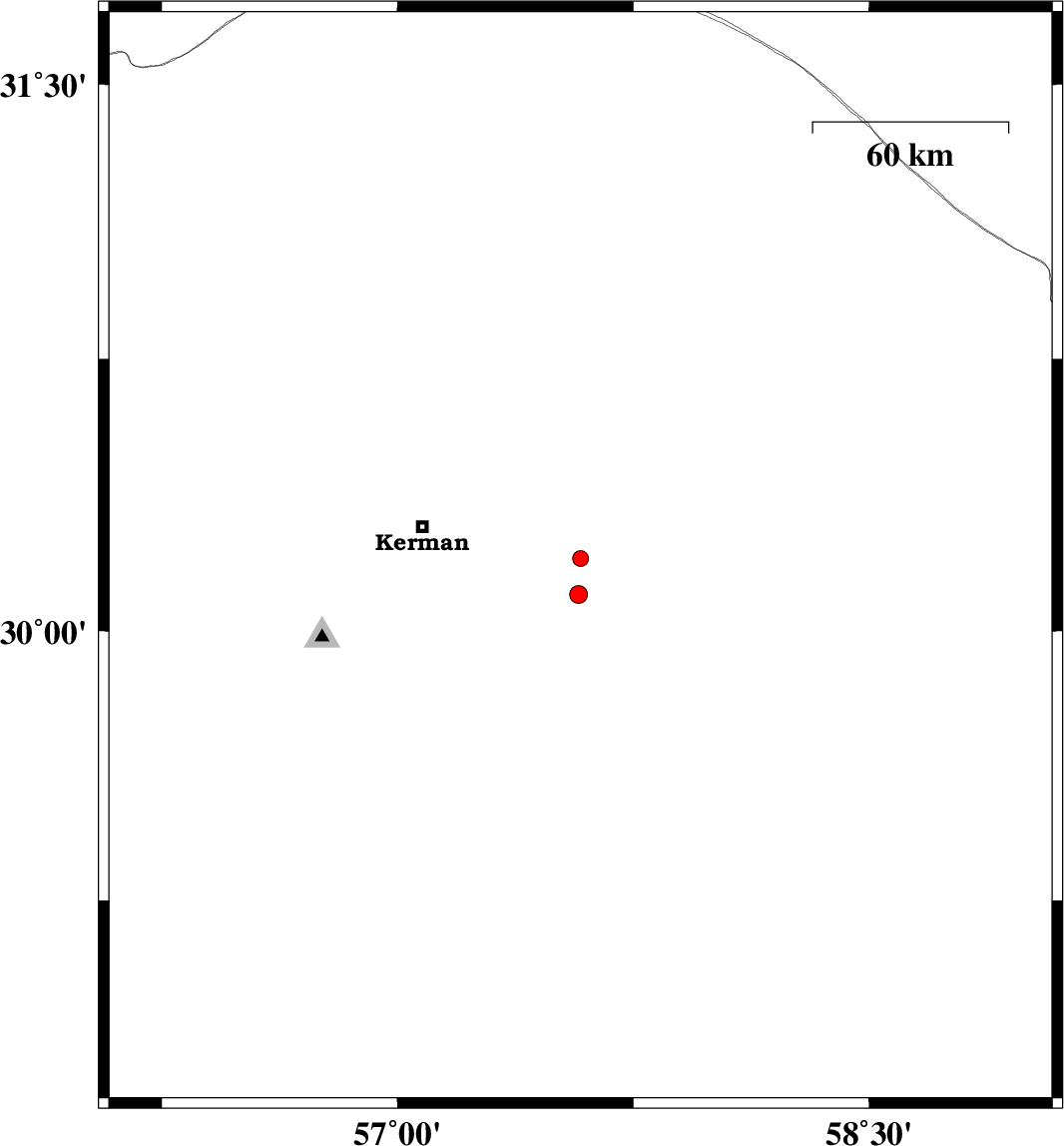 | 2017/11/27 | 01:56:22.0 | 05:26:22.0 | 30.1 | 57.576 | 14 | ML2.6 | Kerman Province, 52 km South-East of Kerman |