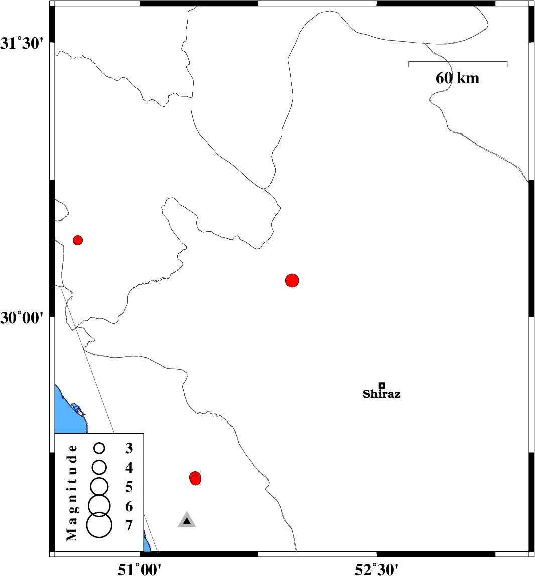 | 2017/12/26 | 12:15:04.2 | 15:45:04.2 | 30.197 | 51.962 | 17 | ML3.8 | Fars Province, 8 km of Ardakan | ||