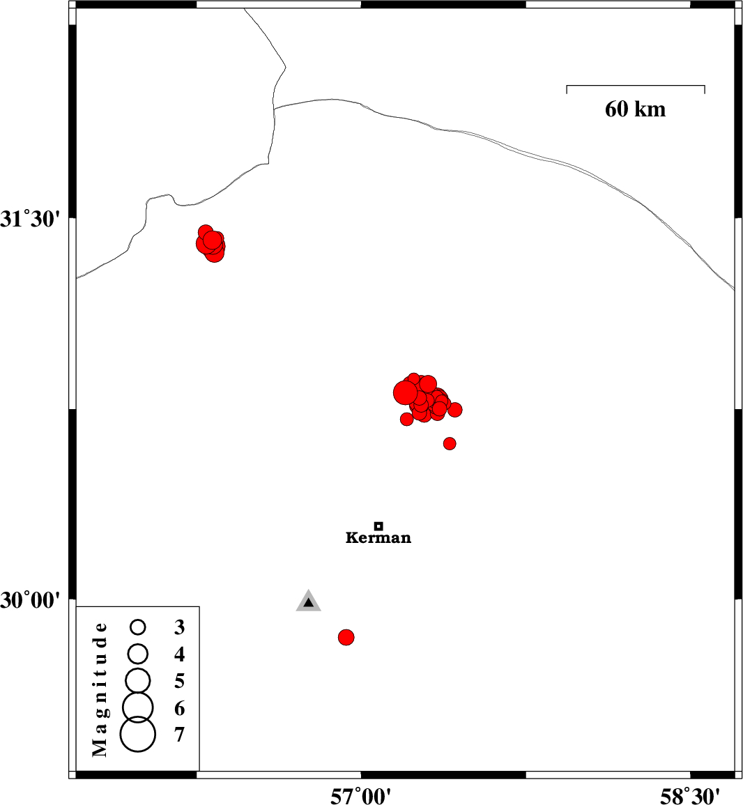 2017/12/25 12:08:23.8 15:38:23.8 30.78157.36714 ML2.6 Kerman Province, 61 km North-East of Kerman