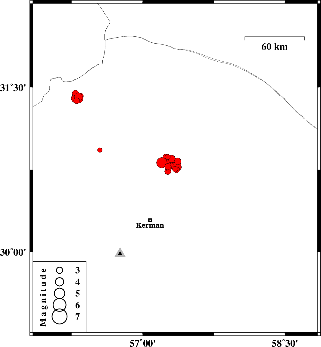 2017/12/25 12:08:23.8 15:38:23.8 30.78157.36714 ML2.6 Kerman Province, 61 km North-East of Kerman