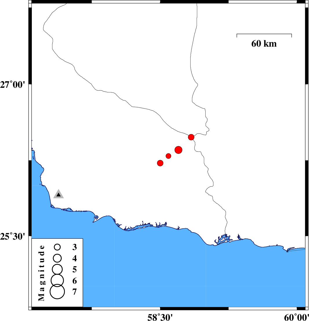 | 2018/01/02 | 07:24:16.2 | 10:54:16.2 | 26.478 | 58.84 | 14 | ML2.9 | Hormozgan Province, 139 km North-West of Nikshahr |