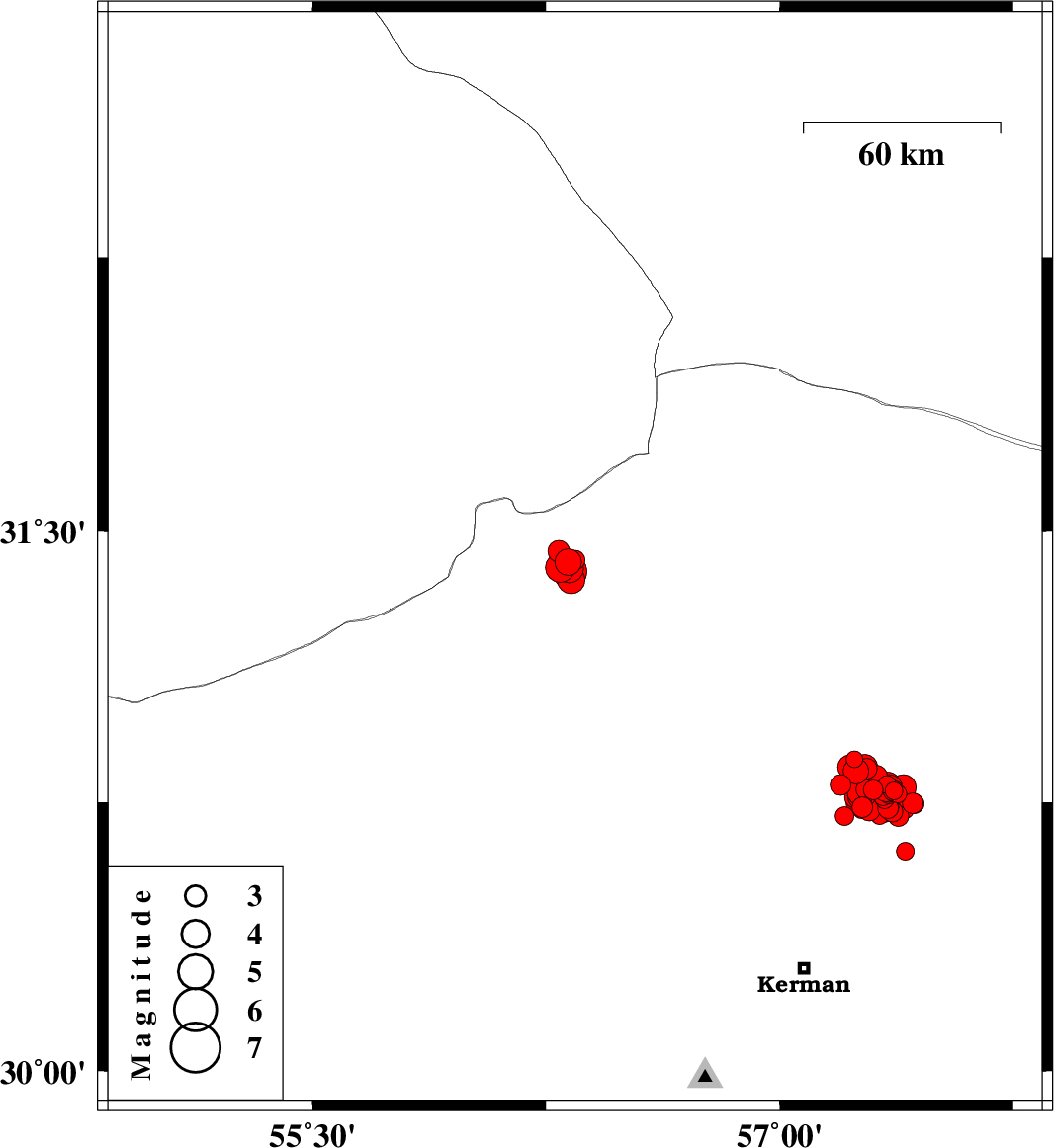 |  | 2017/12/18 | 14:15:06.1 | 17:45:06.1 | 30.712 | 57.321 | 14 | ML2.6 | Kerman Province, 53 km North-East of Kerman |  |