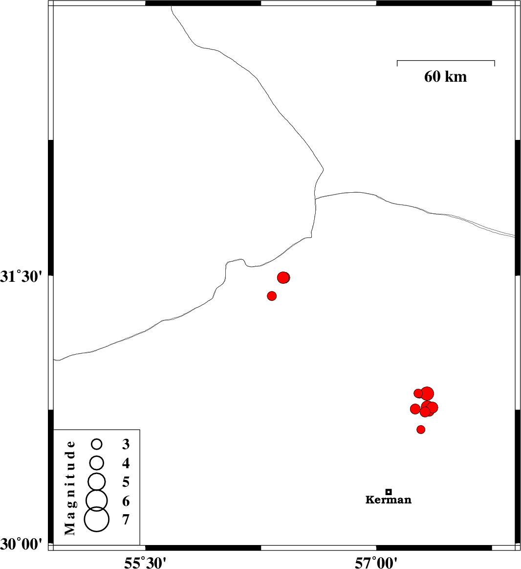 2018/01/10 05:24:47.5 08:54:47.5 30.73757.31614 ML3 Kerman Province, 55 km North-East of Kerman