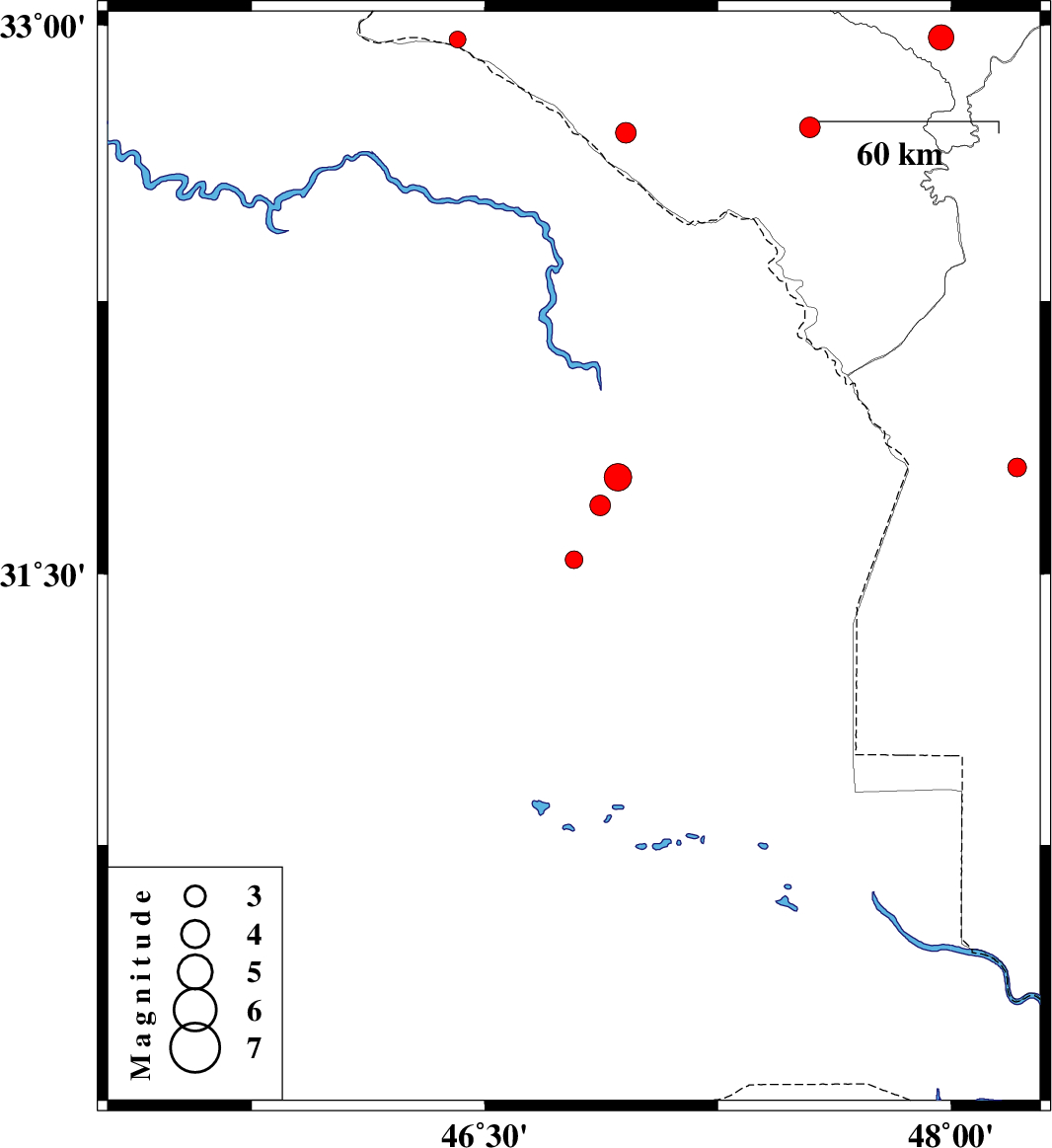 | 2017/12/17 | 22:54:01.5 | 02:24:01.5 | 31.793 | 48.212 | 15 | ML2.7 | Khoozestan Province, 26 km North of Susangerd |