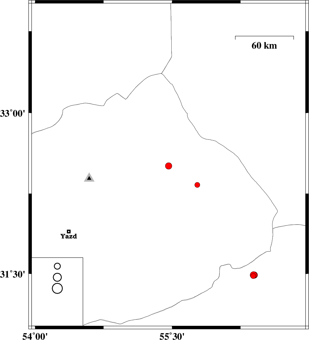 | 2018/01/22 | 10:57:27.1 | 14:27:27.1 | 32.507 | 55.462 | 15 | ML3.3 | Yazd Province, 101 km North of Bafq | ||