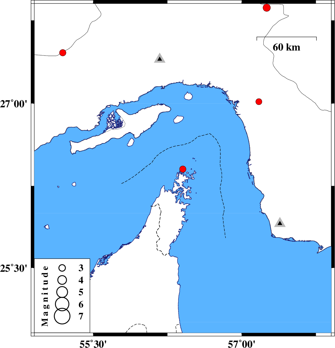 | 2018/01/23 | 04:33:20.4 | 08:03:20.4 | 26.402 | 56.405 | 6 | ML3 | Persian Gulf, 63 km South-East of Qeshm | ||