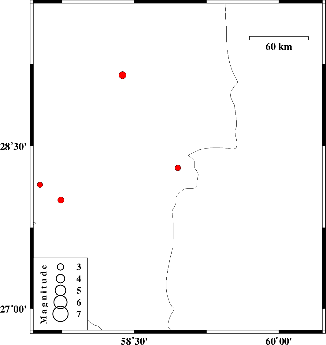 | 2018/01/28 | 23:29:32.0 | 02:59:32.0 | 28.144 | 57.52 | 14 | ML2.5 | Kerman Province, 28 km North-West of Kahnuj |