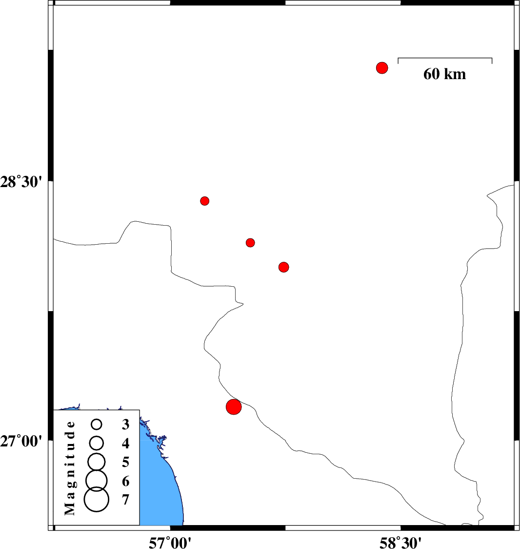 | 2018/01/21 | 20:06:19.7 | 23:36:19.7 | 28.385 | 57.224 | 14 | ML2.5 | Kerman Province, 59 km South-West of Jiroft |