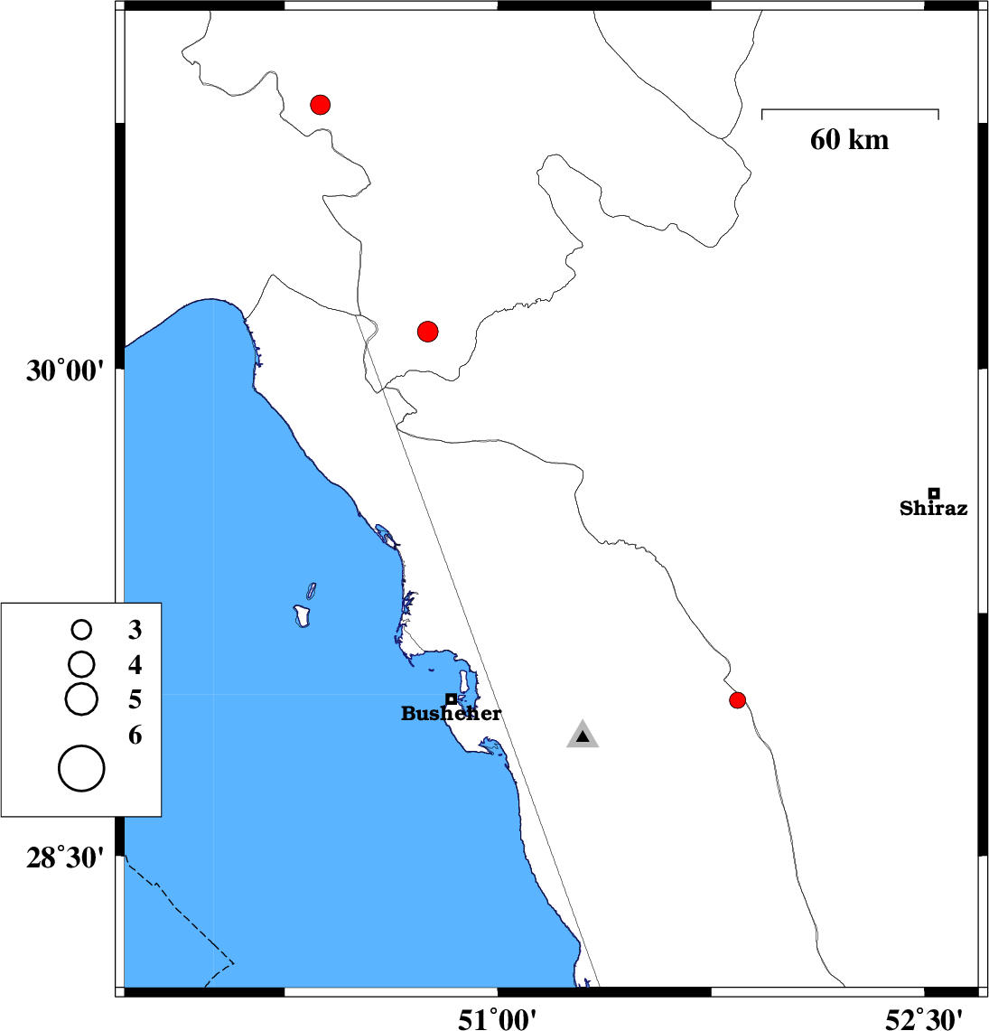 | 2018/01/22 | 13:37:12.5 | 17:07:12.5 | 29.591 | 51.188 | 15 | ML3.3 | Bushehr Province, 37 km North of Borazjan | ||