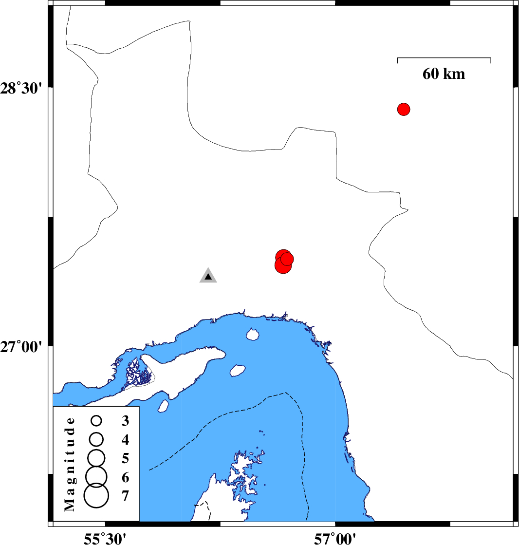 | 2018/03/21 | 22:26:01.9 | 02:56:01.9 | 27.505 | 56.686 | 15 | ML3.8 | Hormozgan Province, 55 km -West of Dehbarez | ||