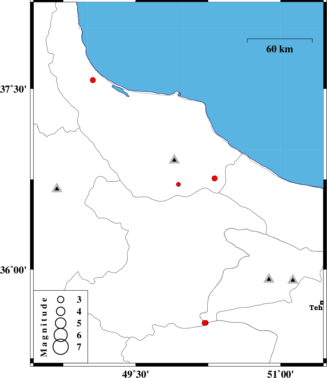| 2018/04/10 | 22:53:06.9 | 03:23:06.9 | 37.571 | 49.057 | 14 | ML2.5 | Gilan Province, 9 km of Rezvanshahr | ||