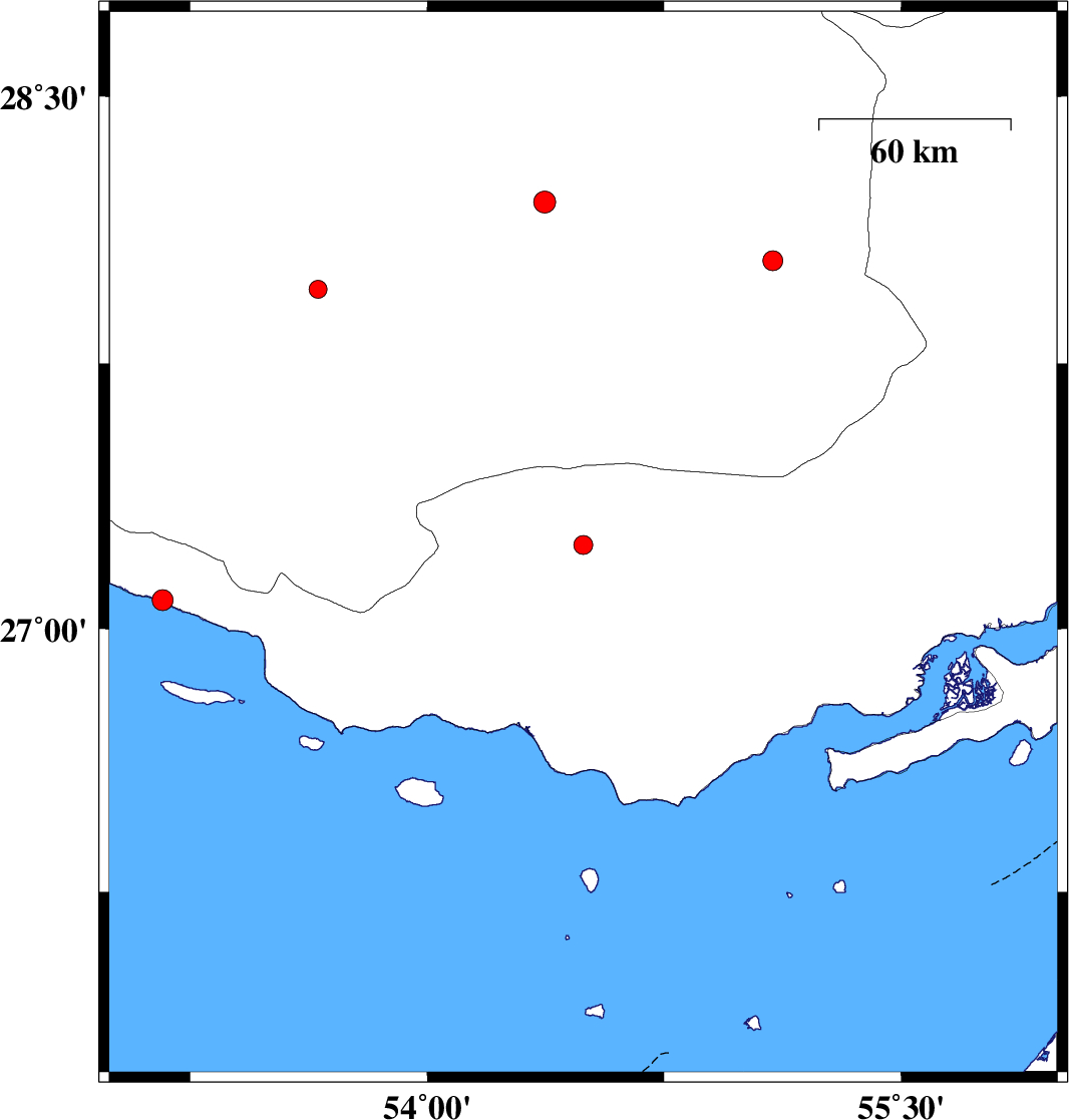 | 2018/04/16 | 01:54:18.7 | 06:24:18.7 | 28.039 | 55.095 | 14 | ML2.8 | Fars Province, 85 km South-West of Hajiabad | ||