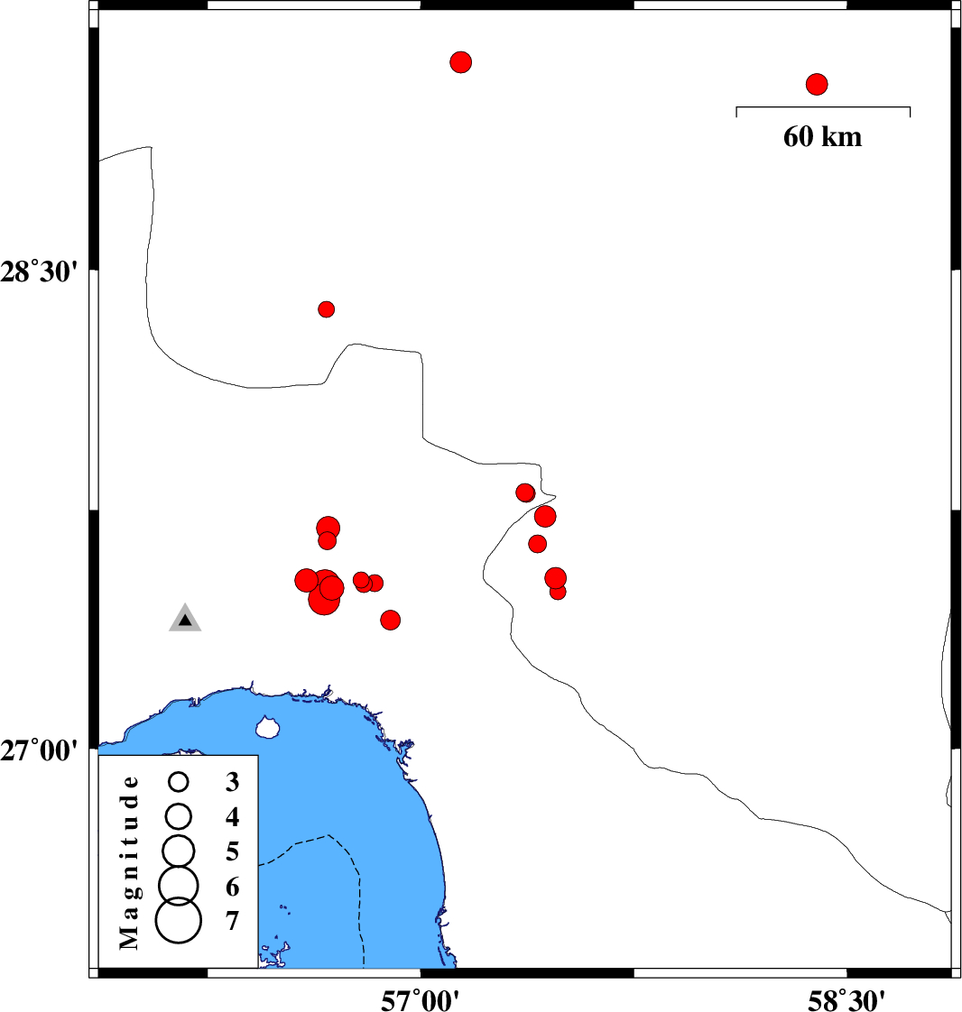 2018/04/11 04:13:22.8 08:43:22.8 27.40456.89310 ML3.1 Hormozgan Province, 34 km -West of Dehbarez