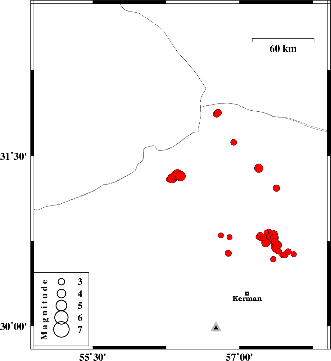 2018/04/12 09:12:53.9 13:42:53.9 30.64556.88640 ML3 Kerman Province, 36 km South-East of Zarand