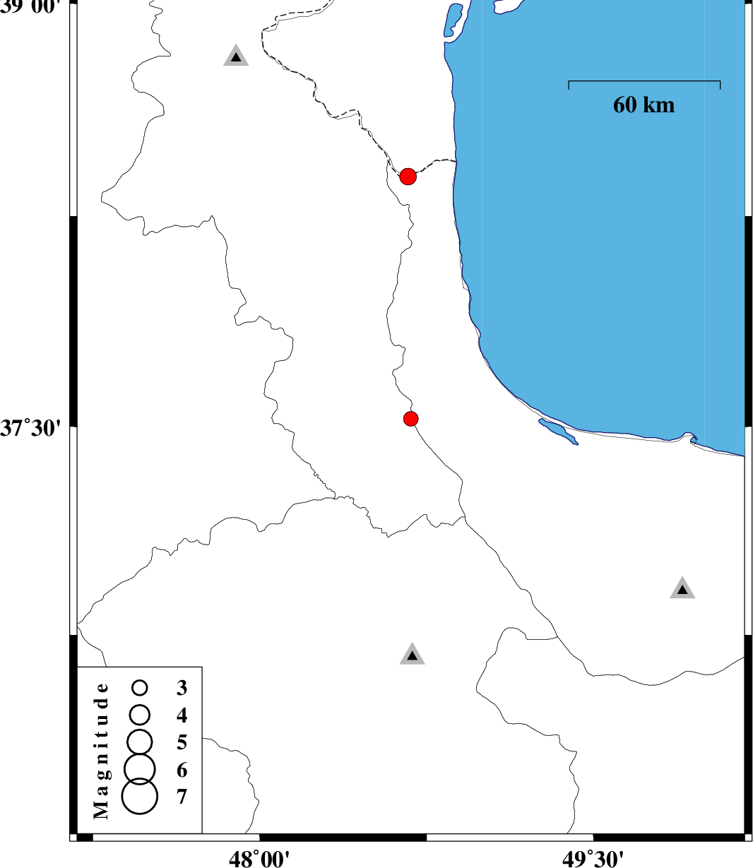 | 2018/04/23 | 13:08:04.1 | 17:38:04.1 | 38.39 | 48.667 | 15 | ML3.4 | Gilan Province, 17 km -West of Astara |