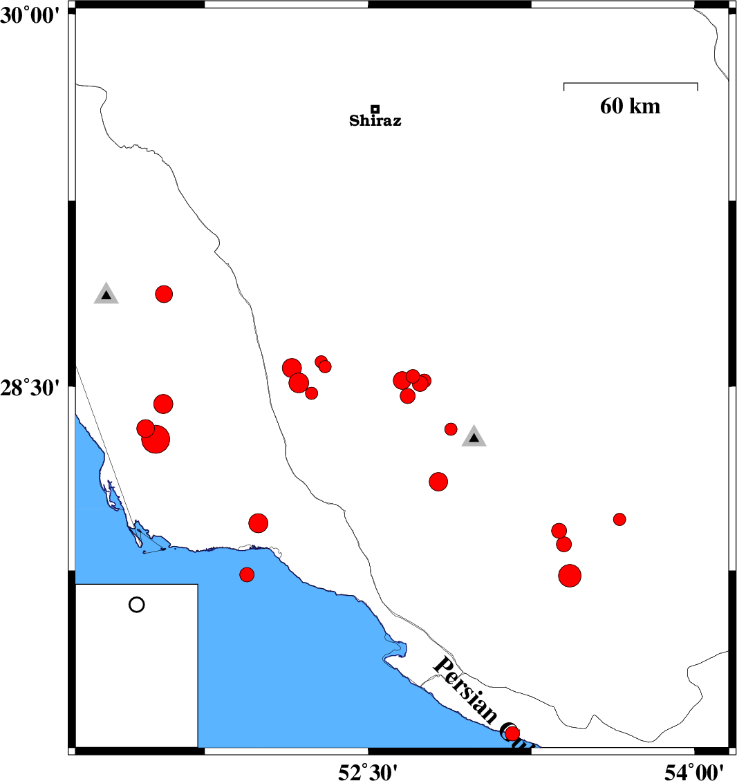 2018/04/29 03:43:35.8 08:13:35.8 28.42851.5622 ML4 Bushehr Province, 31 km South-East of Khormog