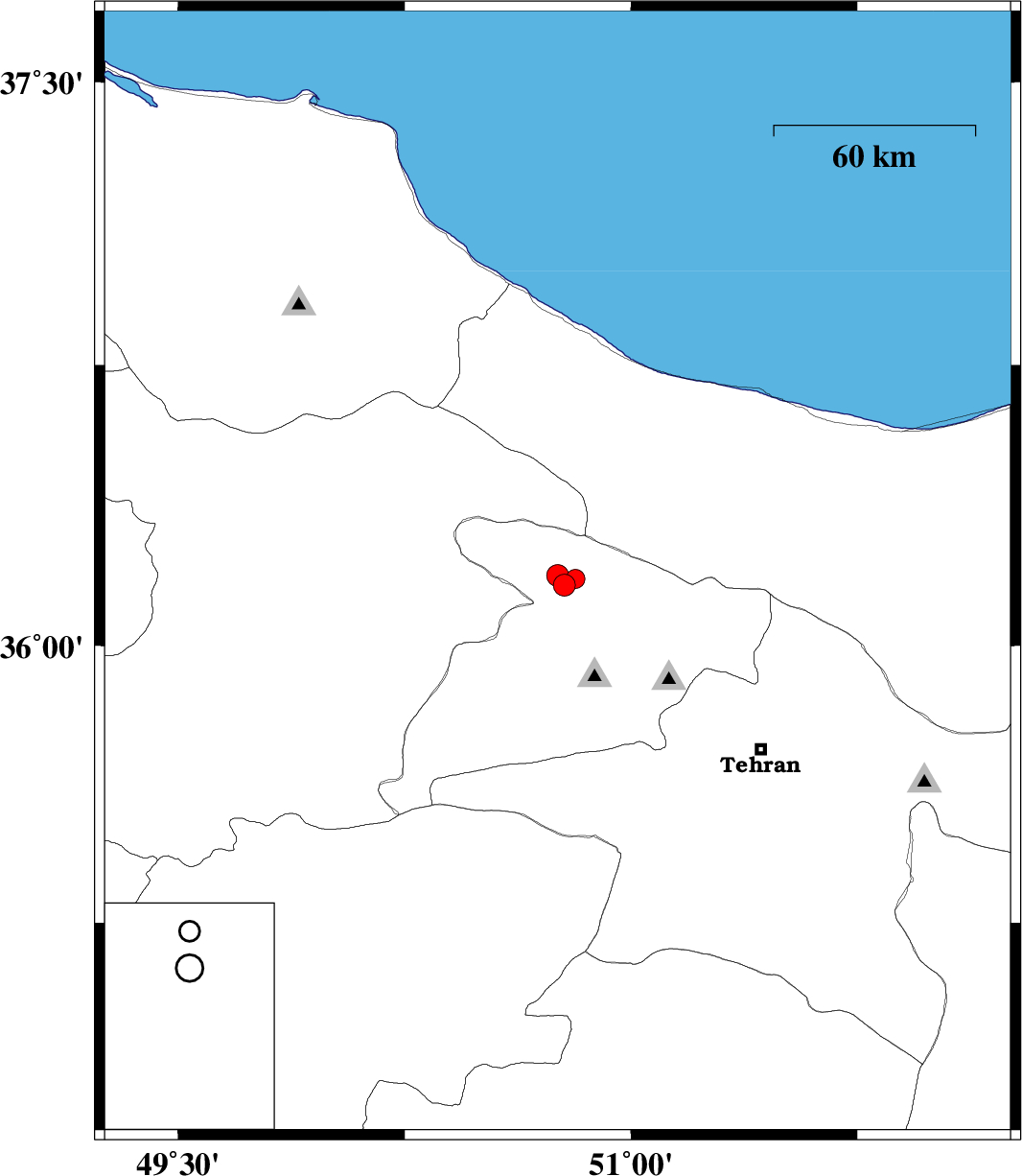 | 2018/05/12 | 23:07:18.7 | 03:37:18.7 | 36.187 | 50.757 | 15 | ML3.3 | Tehran Province, 27 km North of Hashtgerd |