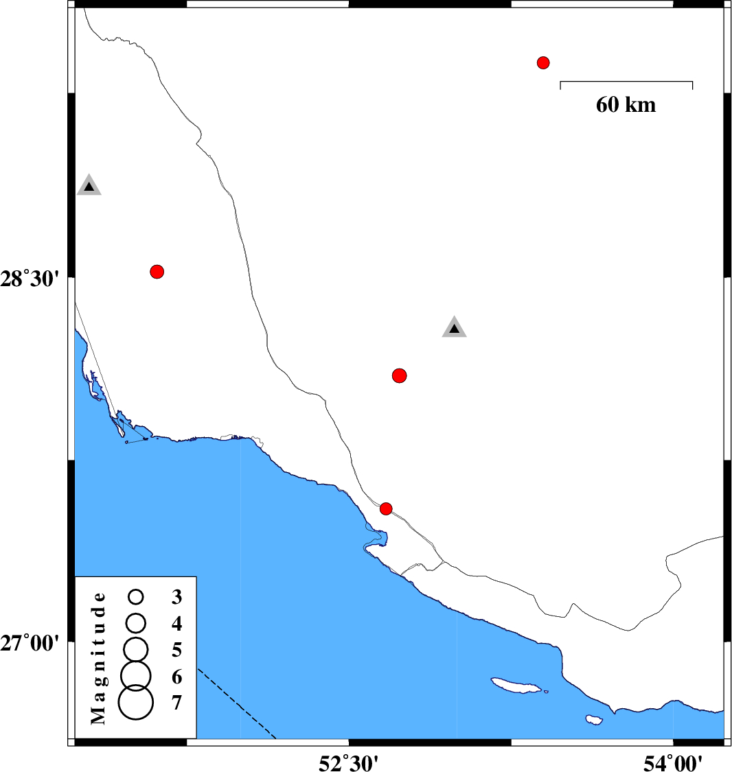 | 2018/05/03 | 06:29:13.3 | 10:59:13.3 | 28.522 | 51.612 | 15 | ML2.8 | Bushehr Province, 28 km South-East of Khormog |