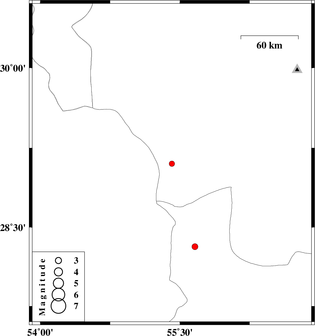 | 2018/05/11 | 10:05:52.3 | 14:35:52.3 | 29.101 | 55.414 | 26 | ML2.7 | Kerman Province, 46 km South-West of Sirjan |