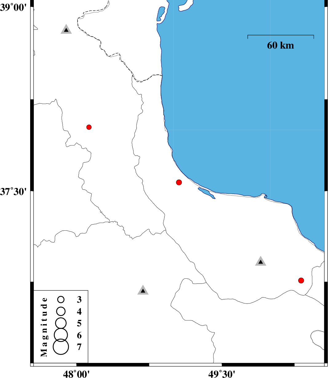 | 2018/04/10 | 22:53:06.9 | 03:23:06.9 | 37.571 | 49.057 | 14 | ML2.5 | Gilan Province, 9 km of Rezvanshahr | ||