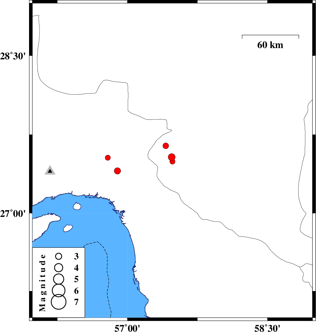 | 2018/04/05 | 04:24:37.3 | 08:54:37.3 | 27.53 | 56.79 | 11 | ML2.6 | Hormozgan Province, 46 km North-West of Dehbarez |