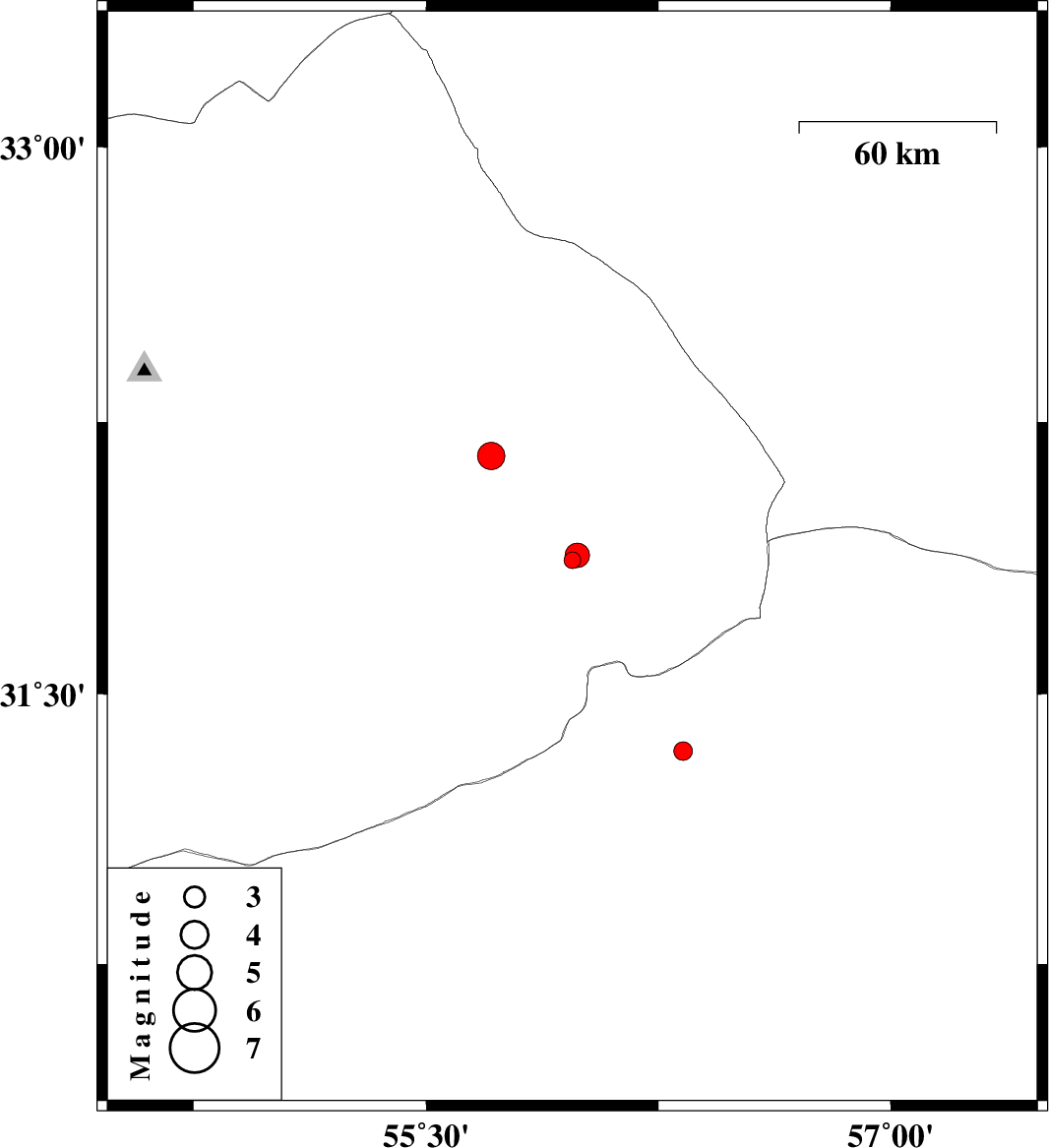 | 2018/05/15 | 00:47:04.2 | 05:17:04.2 | 31.883 | 55.988 | 14 | ML3.5 | Yazd Province, 64 km North-East of Bafq | ||