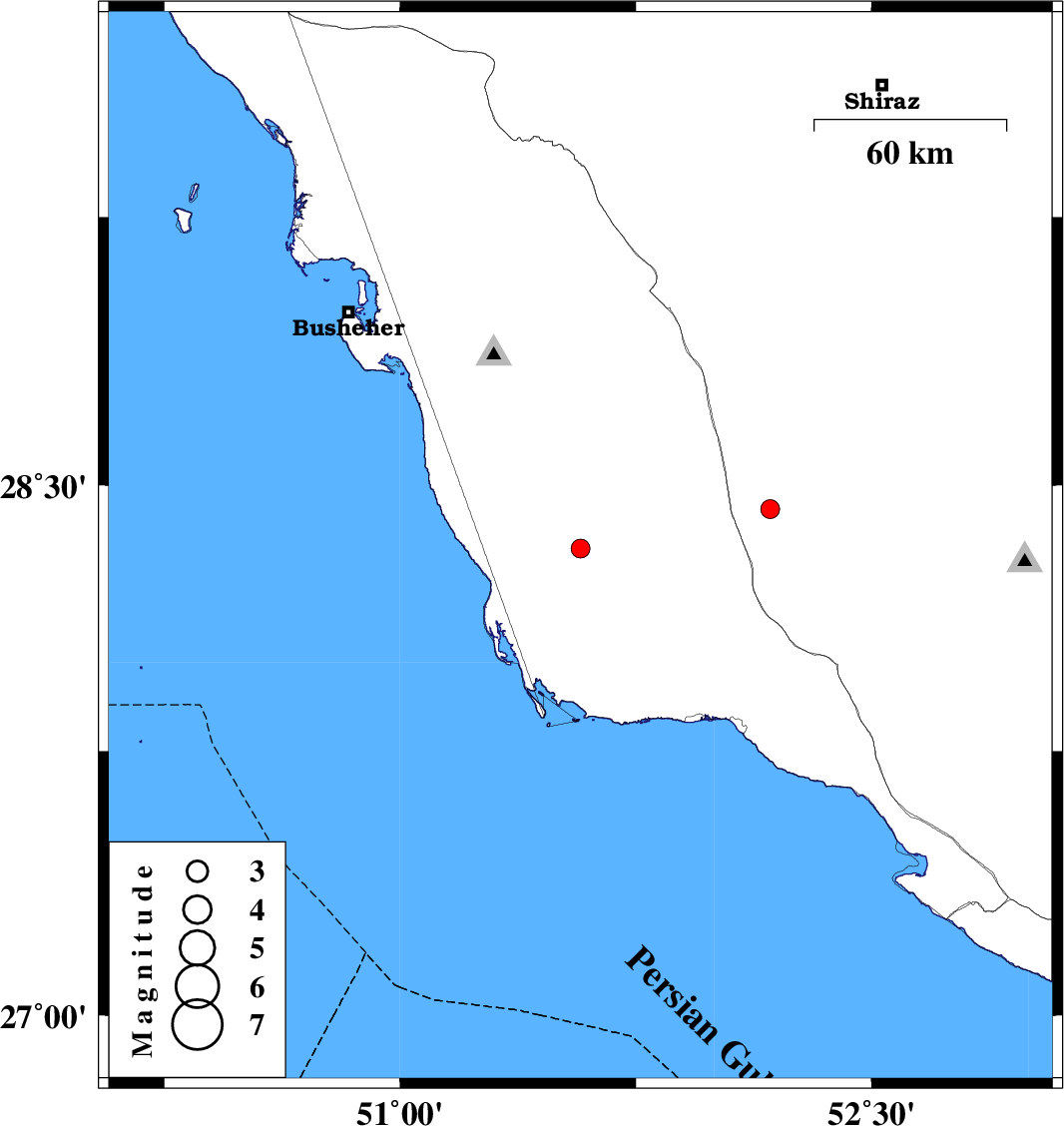 | 2018/05/19 | 13:46:53.5 | 18:16:53.5 | 28.322 | 51.574 | 6 | ML2.7 | Bushehr Province, 42 km South-East of Khormog | ||