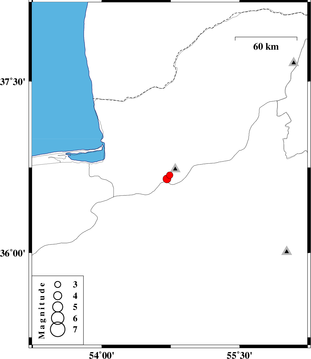 | 2018/05/22 | 13:51:04.5 | 18:21:04.5 | 36.65 | 54.709 | 15 | ML3.9 | Golestan Province, 32 km South-West of Ali Abad |