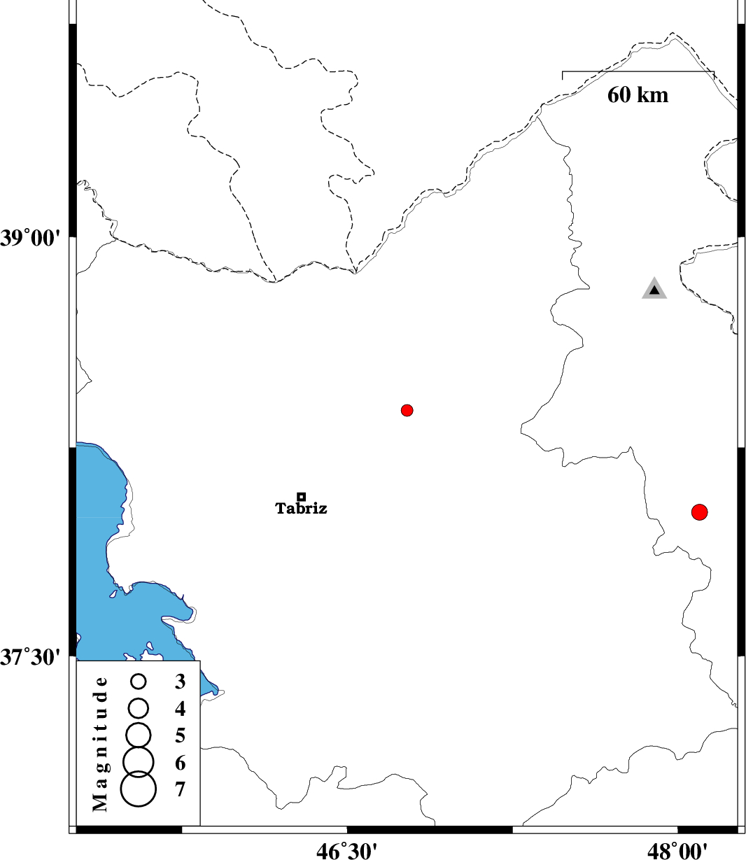 | 2018/06/02 | 06:30:07.2 | 11:00:07.2 | 38.383 | 46.771 | 14 | ML2.4 | Azarbaijan Sharghi Province, 29 km -West of Ahar | ||